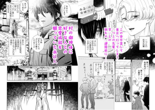 村の神社で起こる不思議なお話が描きたかったのと、この時期ぽやん受けが猛烈に盛り上がっていたので。