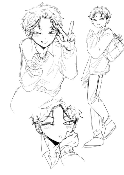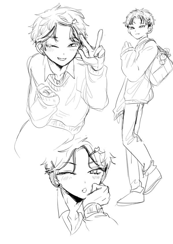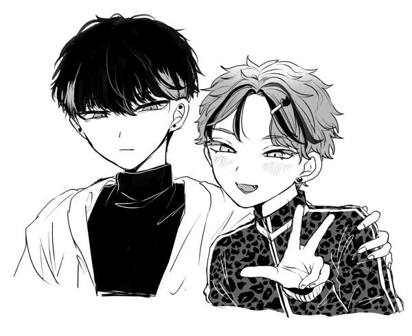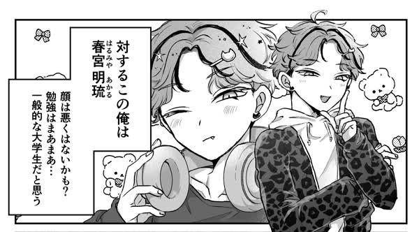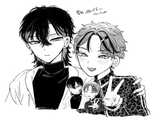 ・ラフ→コマ割り→セリフ入れ→線画〜の順に描いていくスタイルなのですが、セリフを入れてる間は受けの明琉くんを関西弁にするかずっと悩んでました。実際に線画に入った後は今の口調が顔立ちのイメージにピッタリだなと固まっていきました。