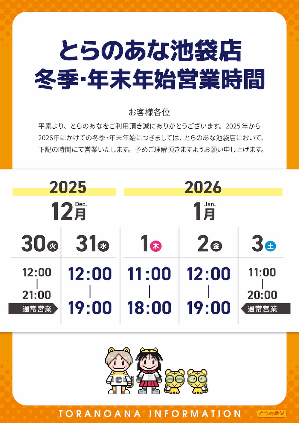 とらのあな池袋店 2025年から2026年冬季・年末年始営業時間変更のご案内