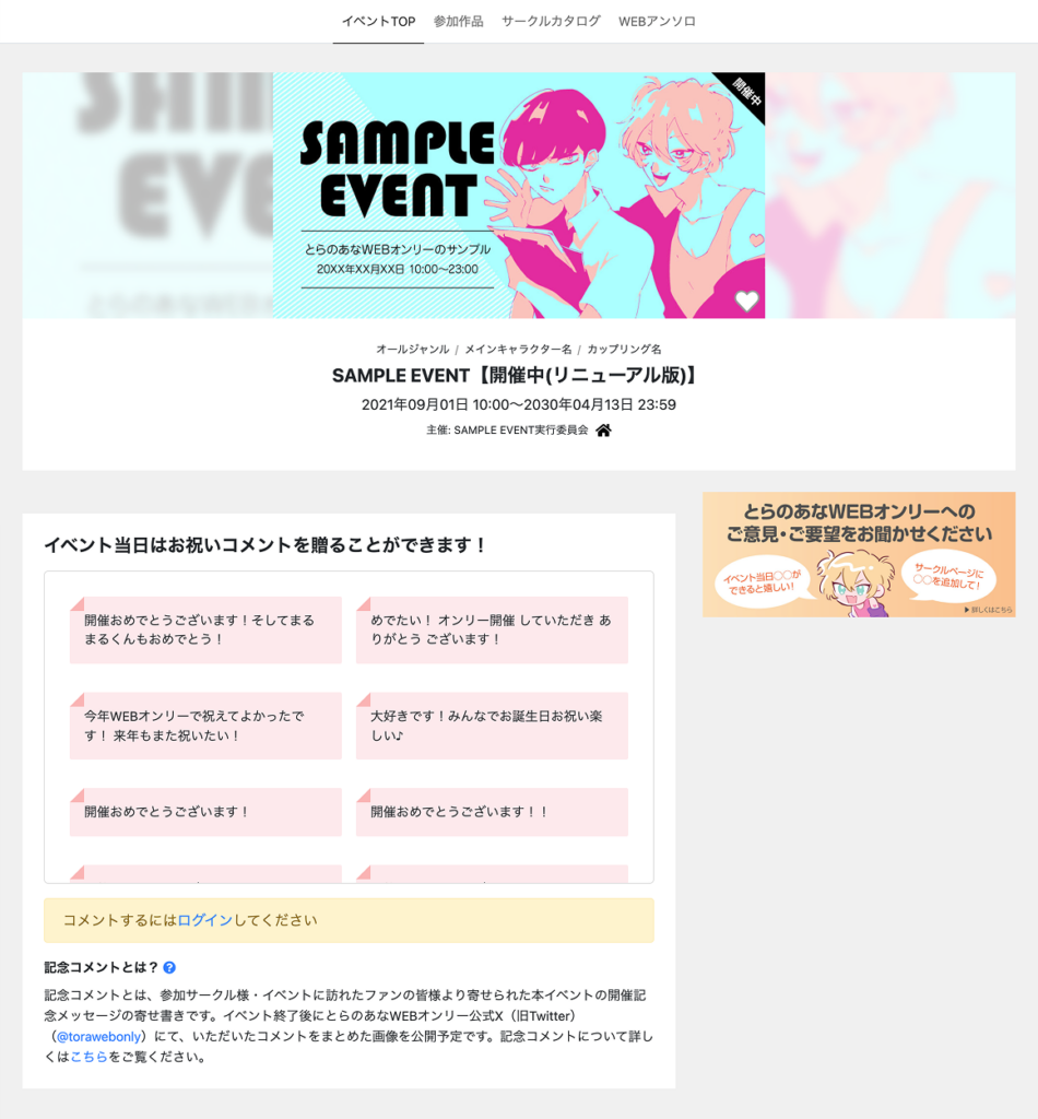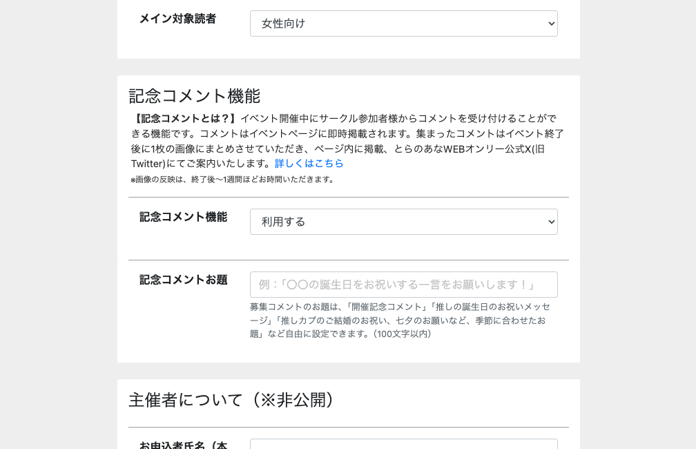 とらのあなWEBオンリー「記念コメント」の設定の仕方などをご紹介します!