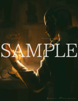 蝋燭の灯火を消そうとする情報将校のイラストをキャンバスに印刷しました。木枠に釘で止められた状態です。サイズはF0(180×140mm)で、厚みは15~20mm程度です。写真のうち、粒のように白く見える部分は光沢です。