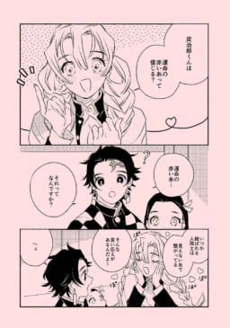 炭治郎が蜜璃ちゃんに赤い糸の由来を聞いたのち、煉獄さんと話す短いお話です。