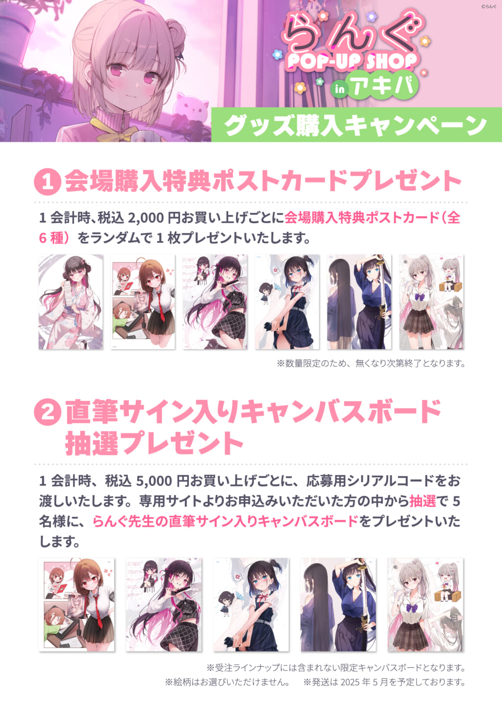 1会計時、税込5,000円お買い上げごとに、応募用シリアルコードをお渡しいたします。専用サイトよりお申込みいただいた方の中から、抽選で5名様に、らんぐ先生の直筆サイン入りキャンバスボードをプレゼントいたします!