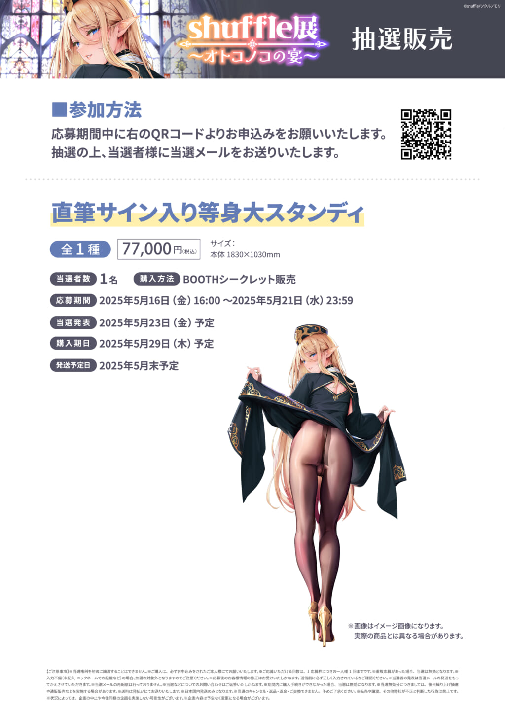 会場にて展示される描きおろしイラストの「エリネース」等身大スタンディに、shuffle先生の直筆サインを入れていただき、抽選で1名様にお届けいたします!