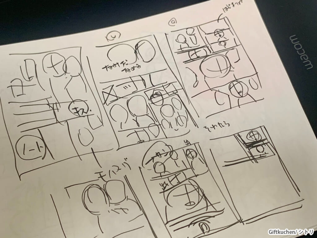 その後は2週間程。ネームを簡単なメモでまとめ、クリスタでコマ割り・アタリ・表情を決めます。