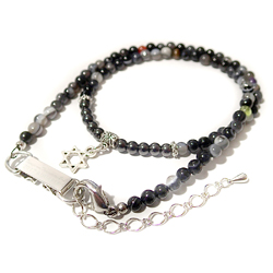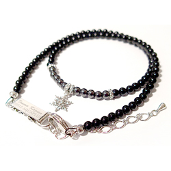 オニキス、ヘマタイト、スノーチャーム、スペーサーで構成されたペンダント。