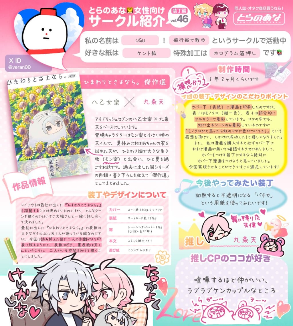 こんにちは❣️とらのあな🐯デザイナーのすずです。 新たにお届けする”同人誌の装丁デザイン”に特化した✨サークルさん紹介-装丁編-、 第42回目はサークル「蛍夏」の「いちや」さんです🌟 ストーリーを感じるような💭こだわり抜いたデザインが美しい✨ 魅力の詰まった装丁の詳細📖と、推しカプへの愛💓をお伺いしました❣️ ぜひお楽しみください♪