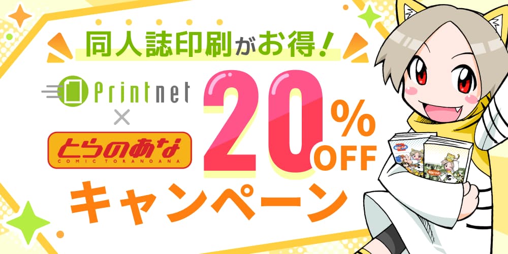 プリントネット様ととらのあながタッグを組んでサークル様の同人誌印刷を応援します!!なんとプリントネット様の同人誌印刷を20%OFFの特別価格でお得にご利用いただけます!