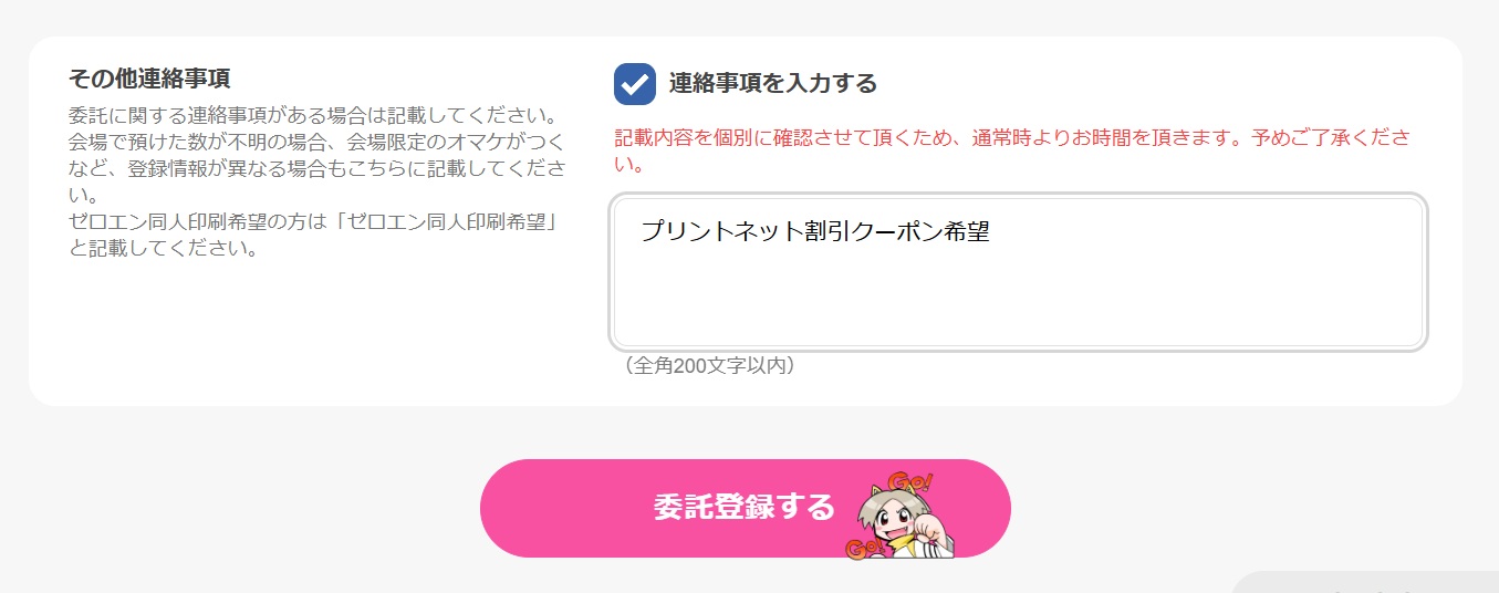 ①サークルポータルより作品登録・追加委託申請の際、とらのあな宛ての連絡事項欄に