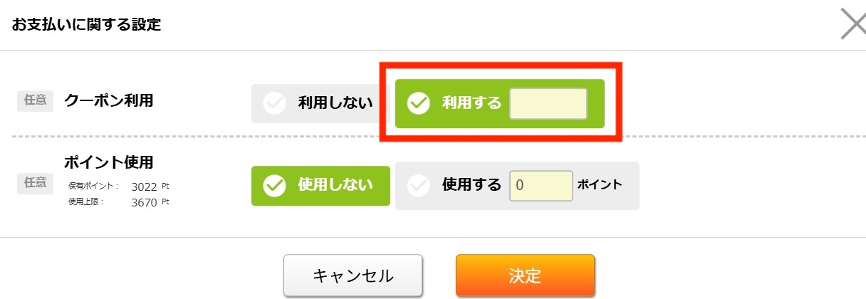 ③とらのあなから受け取った「割引クーポンコード」をプリントネット様の注文時の「お支払い設定」項目、「お支払い内容設定」よりご入力ください。