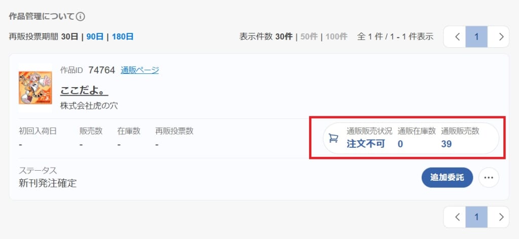 ①「作品管理」画面:【カートマーク】をクリックすると通販販売数、在庫数が表示されます。